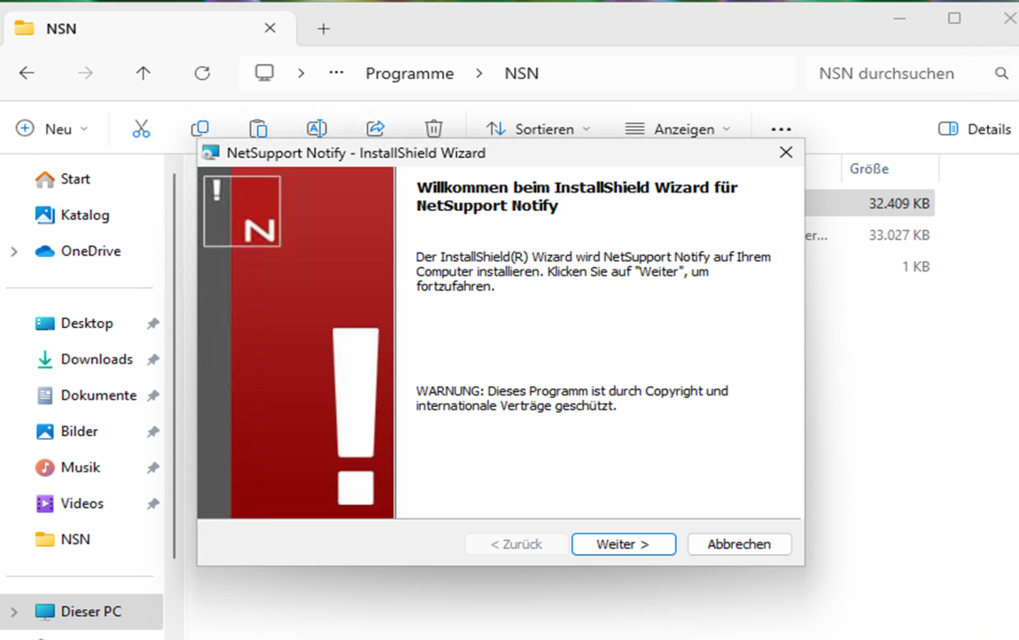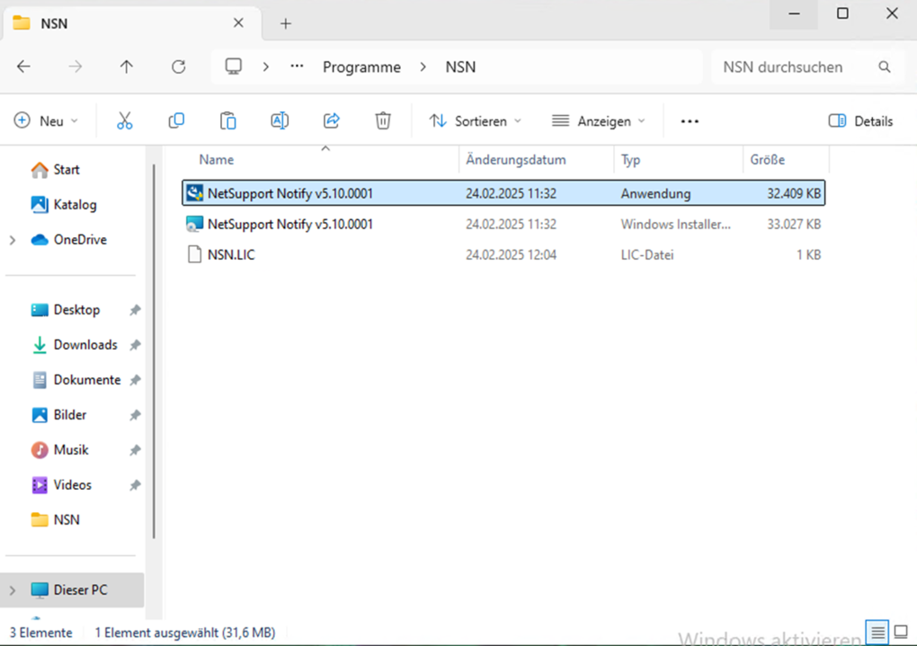 Laden Sie die jeweils aktuellen Installationsdateien vom ProSoft Download Center herunter. Erstellen Sie einen Ordner für die Installation (z. B.: c:/programme/NSN) und verschieben Sie alle ausführbaren Dateien zusammen mit der *.lic Datei in den erstellten Ordner. Diese Anleitung ist für alle NetSupport Lösungen und nicht nur für NetSupport Notify.
