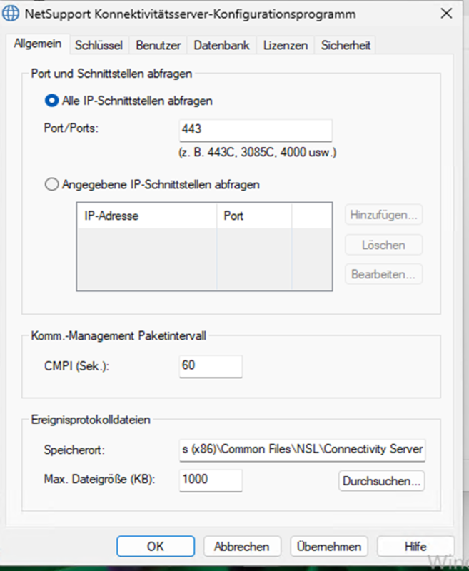 Unter „Allgemein“ kann die IP-Adresse und Port/Ports angepasst werden.