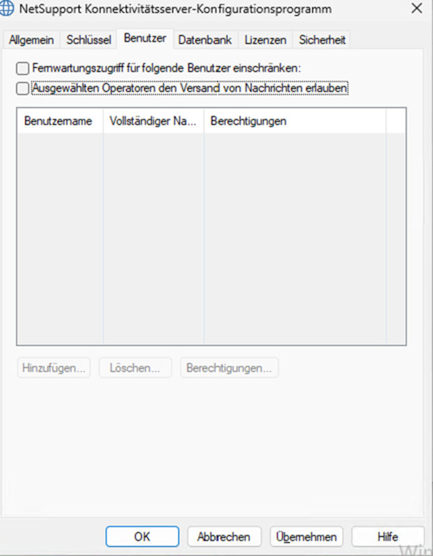 Unter „Benutzer“ können Sie den Fernwartungszugriff einschränken oder ausgewählten Operatoren den Versand von Nachrichten erlauben.