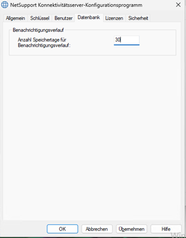 In dem Reiter „Datenbank“ können die Anzahl der Tage eingetragen werden, in dem der Benachrichtigungsverlauf gespeichert werden soll.