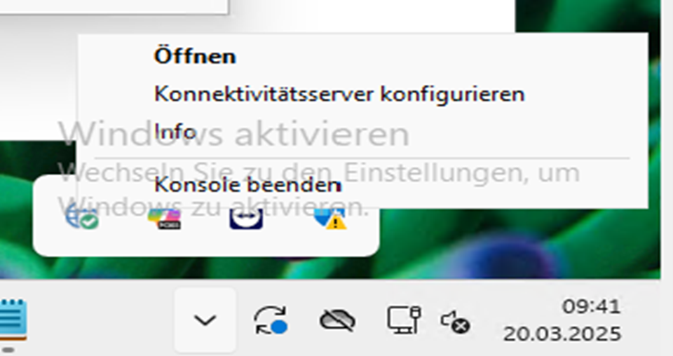 In der Taskleiste auf den Pfeil nach oben klicken. Im Kontextmenü auf das NetSupport Notify Symbol, mit einem Rechtsklick das Kontextmenü öffnen und die Option „Konnektivitätsserver konfigurieren“ (= Gateway) anklicken.