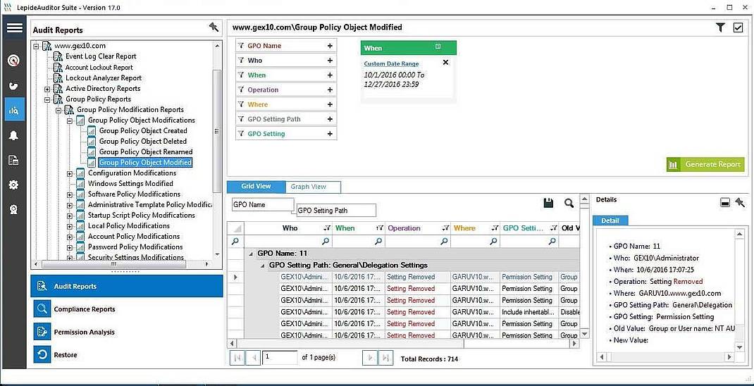 Die über 40 integrierten Lepide Auditor Reports dokumentieren alle Änderungen an Gruppenrichtlinien. Dazu zählen natürlich auch die Vergleiche mit historischen Änderungen, die in der Datenbank gespeichert sind. Alle Reports entsprechen den Vorgaben im Bereich Dokumentation- und Nachweispflicht der neuen EU-DSGVO/GDPR. Compliance-Berichte. Spezielle Reports und sind auch für HIPAA-, PCI-, FISMA-, SOX- und SAS-Zertifizierungen verfügbar.