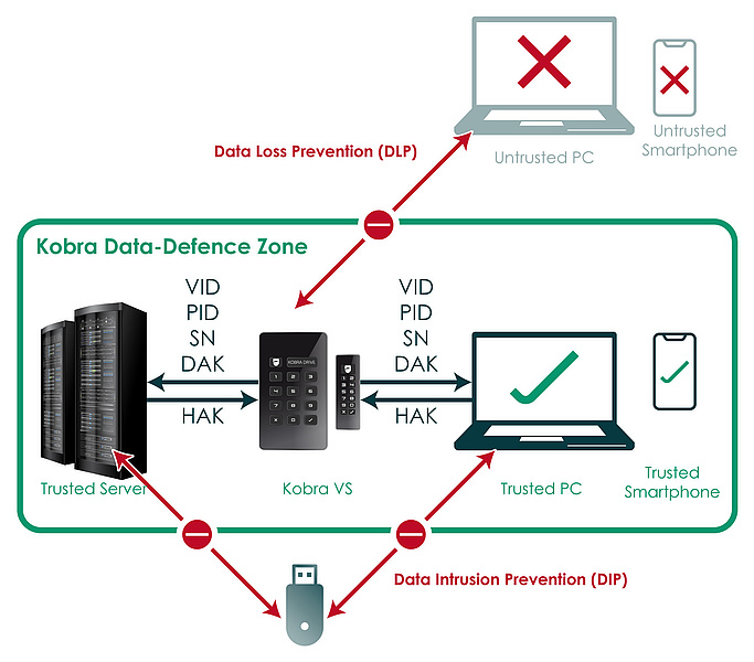 FAZIT: Durch die Kobra Data Defence Zone wird sichergestellt, dass die Kobra VS Datenträger nur an registrierten Endgeräten und Servern eingesetzt werden können, und sie ermöglicht den Datentransfer nur zwischen vertrauenswürdigen Endgeräten.